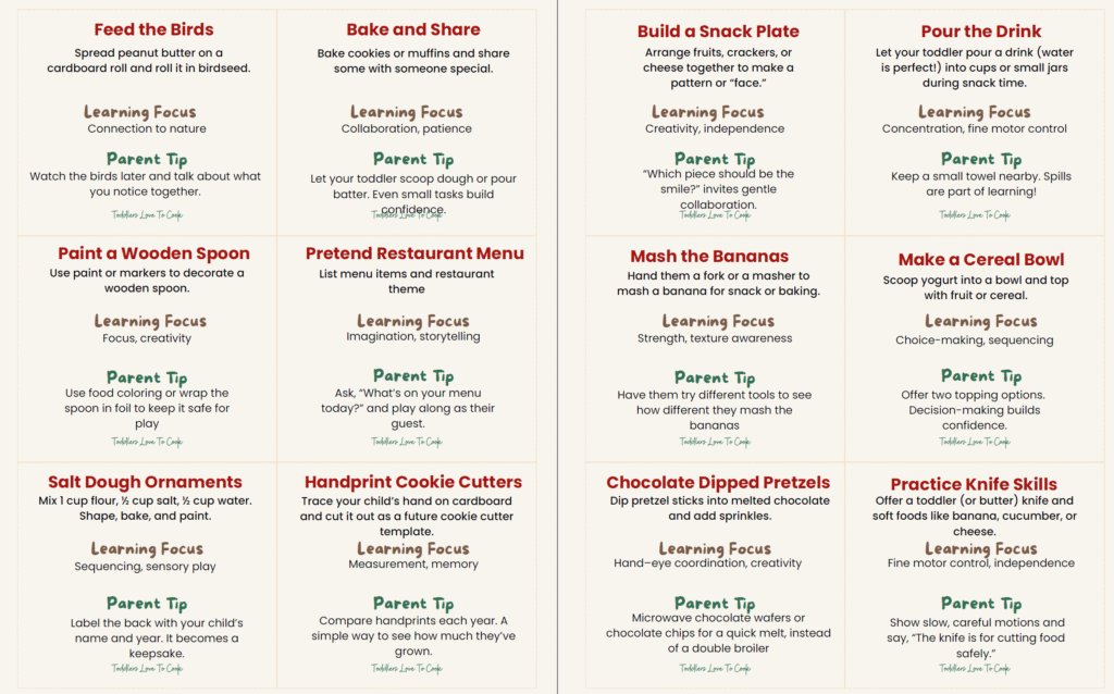 Toddler Cooking Advent Cards – 24 days of screen-free cooking activities perfect for December traditions without the sugar overload. Each card includes simple, picture-based instructions for ages 3-8.